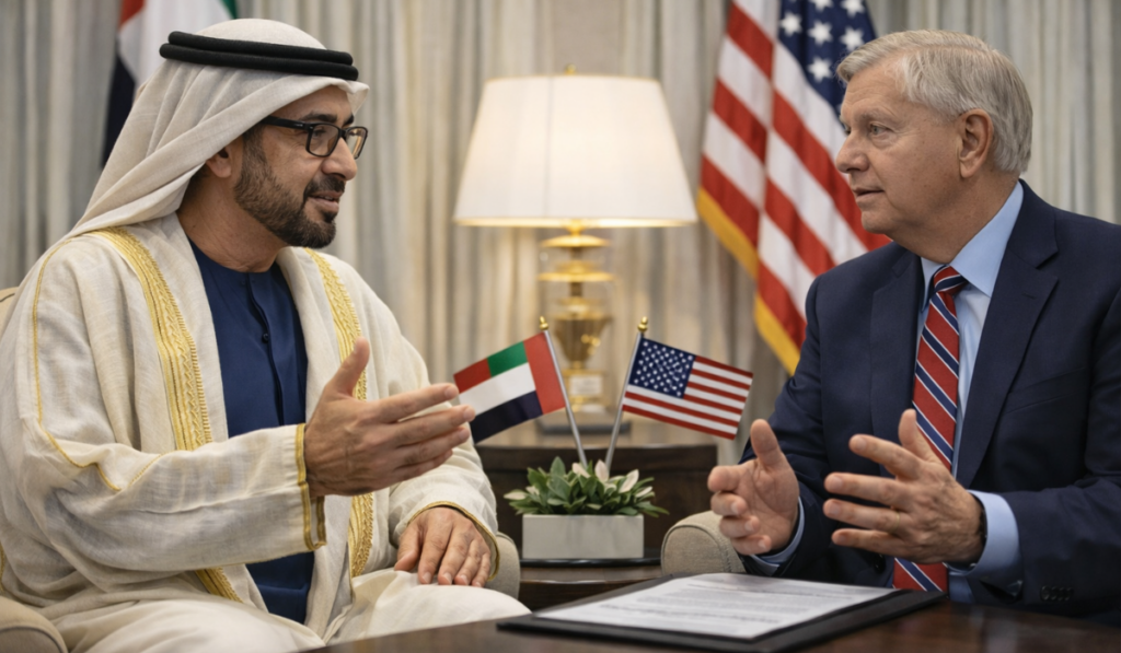 UAE President His Highness Sheikh Mohamed bin Zayed Al Nahyan met with United States Senator Lindsey Graham at Qasr Al Shati in Abu Dhabi, underscoring the depth of strategic ties between the two nations.
